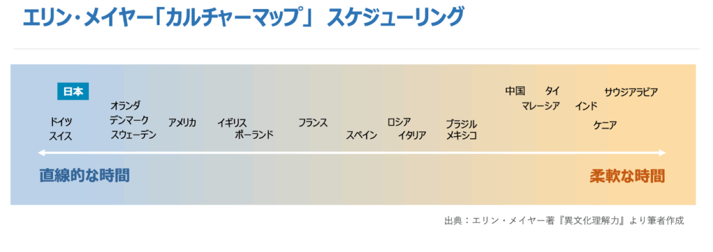 この指標において、日本はドイツ・スイスと並んで最も「直線的な時間」寄りに位置しています。